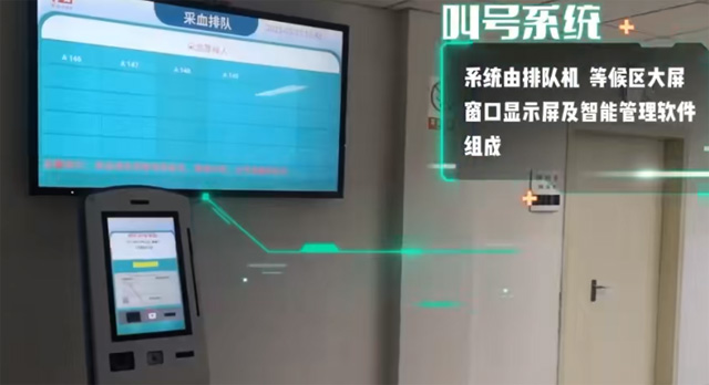 等候区大屏幕窗口,显示屏和只能管理软件组成。病患可以通过身份证、就诊卡、手机APP二维码、社保卡等等方式。扫码刷卡进入排队序列,空腹等特殊项目也可以设置个性化弹窗服务。病患根据语音内容到指定窗口采血。排队规则也可以自定义设置。实现高效人性化排队机制。