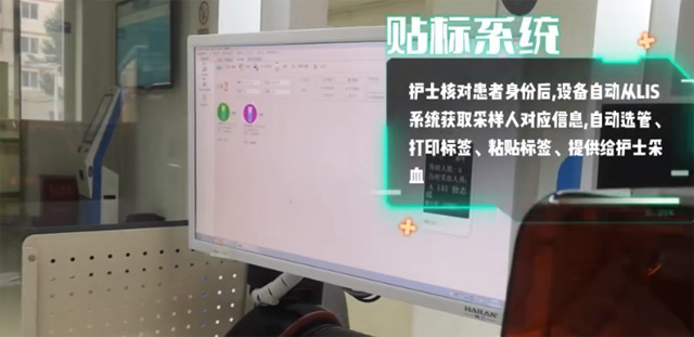 医护人员核对患者的身份信息,设备自动获取采样人对应信息,自动选管,打印标签、粘贴标签,提供给医护人员采血。选管、贴标、打条码、出管,护士只需要做消毒扎针工作就可以了。选择对应颜色的采血管边打印对应标签,保留原有的刻度线进行贴标粘贴。自动复核提供给医护人员使用。医护人员取管确认信息后进行采血操作,将采完血的样本放入传输系统里面。