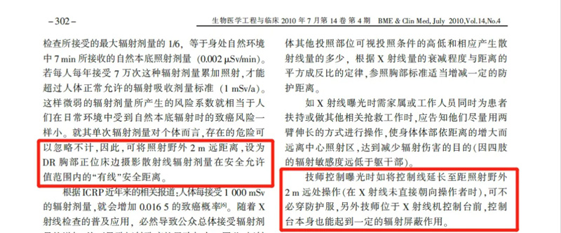 移动DR是可以在病房进行检查的X射线检查机器。移动到各个科室对病患进行检查。但是它又不像放射科有辐射屏蔽条件。那么移动DR在检查过程中,同个病房的病人跟检查的医护人员需要怎么样的防护呢?一般危重病人,手术室中抢救的病人,不能移动的病人才能使用移动DR。移动DR的电流在400-650mA,而其他普通DR的电流在600-800mA之间。在胸片拍摄的工作电流一般大概在250mA。有使用不定时不固定位置的特点。胸部放射线辐射剂量均低于自然本底照射值。《数字X射线摄影机床边胸部摄影时周围散射线量测量》距照射野外2米有限安全距离,其散射线剂量低于人体7分钟所接受的自然本底照射剂量。自然本底环境照射野外2.5米无线安全距离。