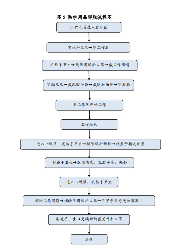 除X线电离防护外,方舱CT检查需对操作技师、患者及家属做相应的防护。根据国家卫生健康委办公厅印发的《新型冠状病毒肺炎防控方案》(第五版)[6]对于在新型冠状病毒感染的肺炎疫情防控工作中不同的工作人员其防护等级是不同的。如是疑似患者,技师则执行二级防护。方舱CT内,设置清洁区、一脱区、二脱区、免洗手消毒液、一次性防护服、一次性乳胶手套、鞋套、洗手液。技师需经多次反复训练穿脱流程和检查流程,并做好总结,考察合格方可上岗。为此我科花费了大量时间进行了防护用品穿脱,消杀,接诊流程的演练,并做总结和改进措施。(附件1所示),防护用品穿脱流程如图2所示。
