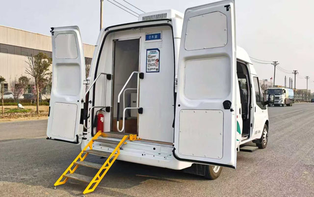 DR体检车集成专业DR影像系统、辐射防护、智能登记、数据传输于一体的移动医疗平台,高端影像设备到智慧医疗系统,从体外诊断到康复护理,相当于一个车轮上的标准化放射科。核心配置:搭载高频高压发生器、高清平板探测器、专业影像工作站,成像清晰、辐射剂量低,满足胸部DR、脊柱筛查等常规诊断需求。单台车单日可服务150-300人次,效率远超传统模式。DR体检车是移动医疗的硬核装备,更是健康中国建设的重要支撑。布局兼顾上下车便利性与隐私保护。,尤其适用于基层老年人体检等公卫服务场景。