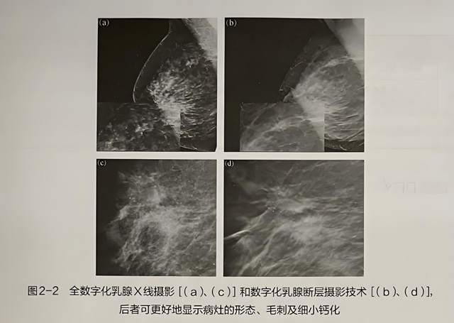 DBT是一种以乳腺X线摄影技术为基础的三维成像技术,可减少组织重叠对诊断准确性的干扰。DBT通过围绕乳腺弧形旋转的X线球管多角度曝光,获得乳腺在不同角度下的影像,然后根据组织体积将其重建成一系列高分辨率的体层影像。 每层约1mm厚的组织位于焦点上,其上面或下面的组织显示于焦点外,以减少重叠组织的成像。DBT在乳腺疾病中的优势:①克服传统二维图像组织重叠的影响:②对病灶边缘显示更清楚;③对一些细小钙化显示更清楚:④提高乳腺疾病诊断的准确率(图2-2)。