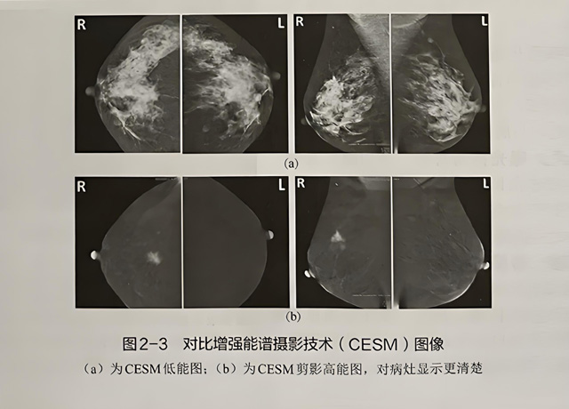 CESM是在“乳腺钼靶”基础上衍生的一项新技术。CESM是通过静脉注射对比剂后进行高能量和低能量曝光,观察病灶是否增强(黑白图像中“变亮”的影像),经过后处理获得低能图和减影图,可在一定程度 上反映乳腺病灶摄取碘对比剂的能力,间接反映其血供情况,而且减影图像可去除周围正常重叠腺体,使病灶清晰显示。CESM生成两套“钼靶图像”一套低能图,与常规钥靶图像类似:另-套剪影图,为剔除乳腺正常腺体组织背景直接显示强化“变亮“的病灶图像。CESM能够做到“去伪存真”,显著降低假阳性率和假阴性率,也大大提高影像医师的工作效率和诊断能力(图2-3)。